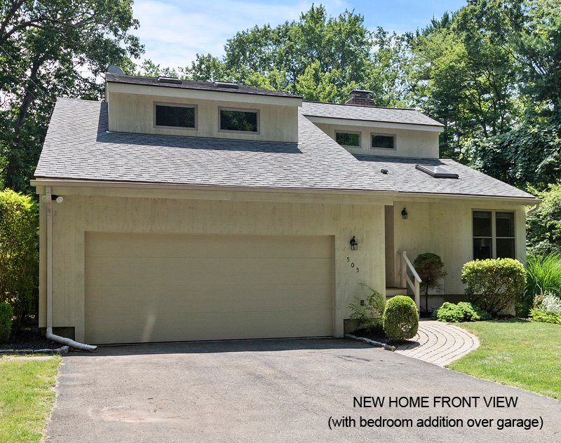 2023 home front view with bedroom addition, new siding, gutters, front stoop, etc.