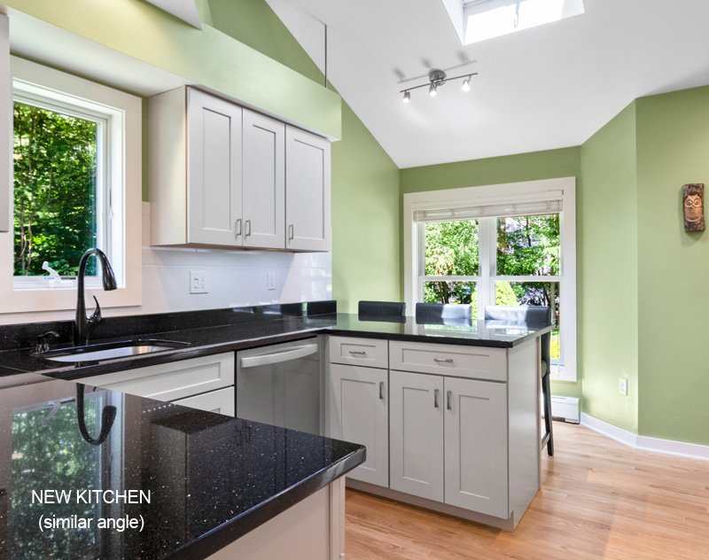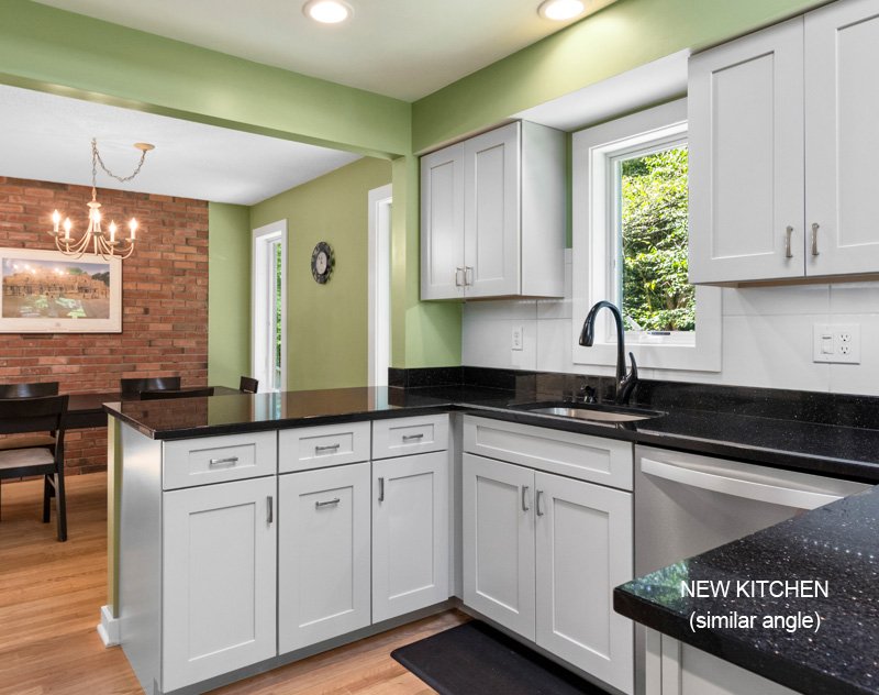New kitchen (similar view) - added peninsula with bar seating, replaced tile floor with hardwood, new cabinets and granite countertops