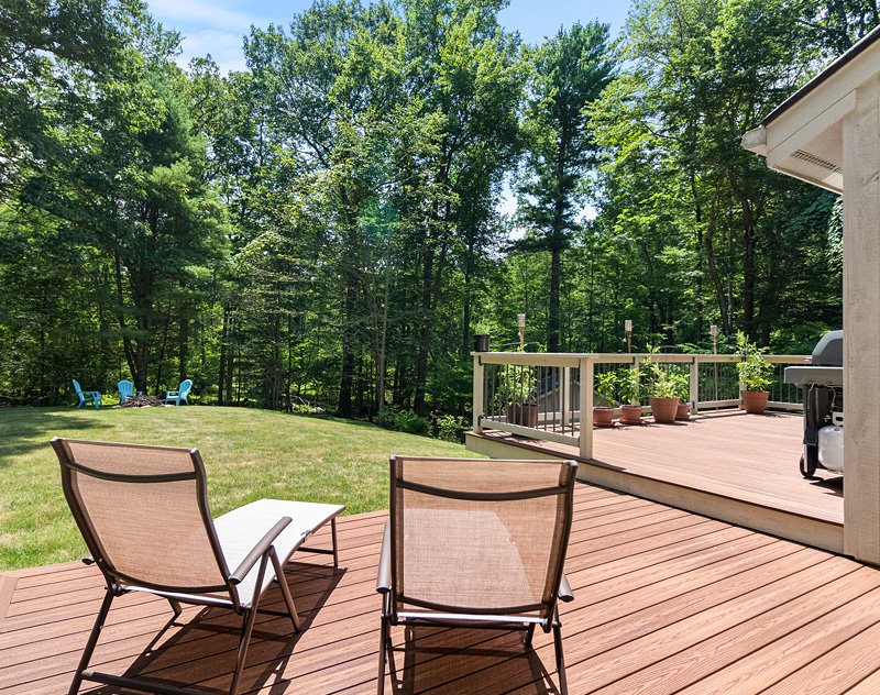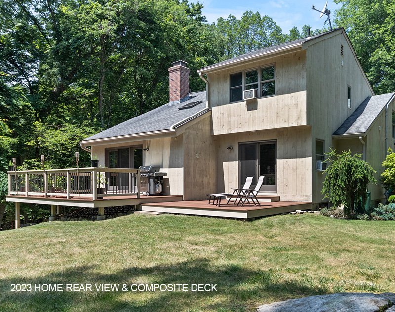 2023 home rear view with new, expanded composite deck, exterior doors & windows