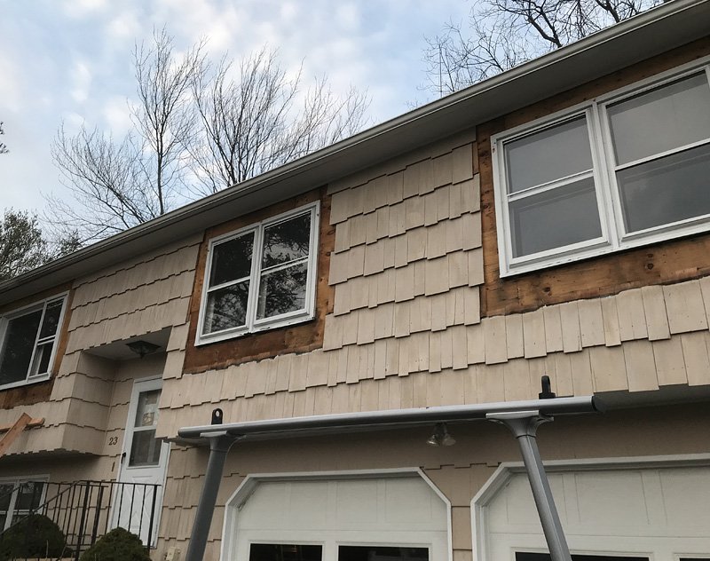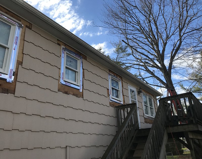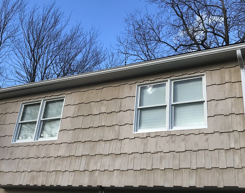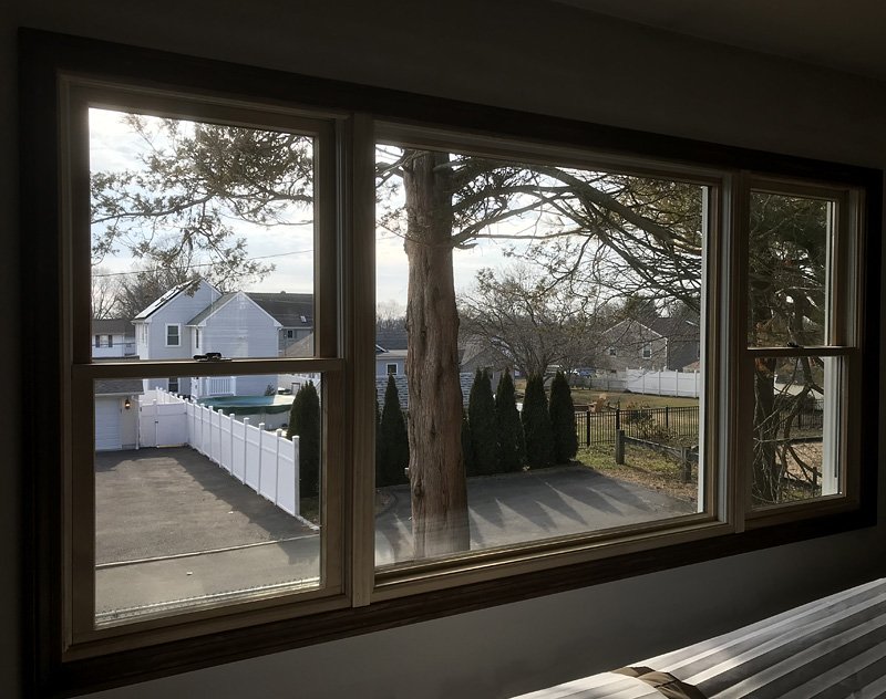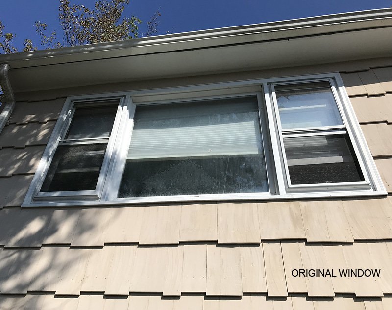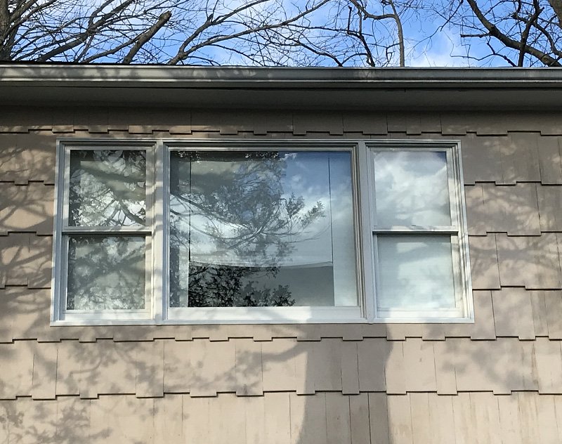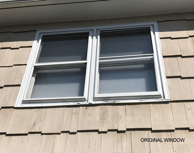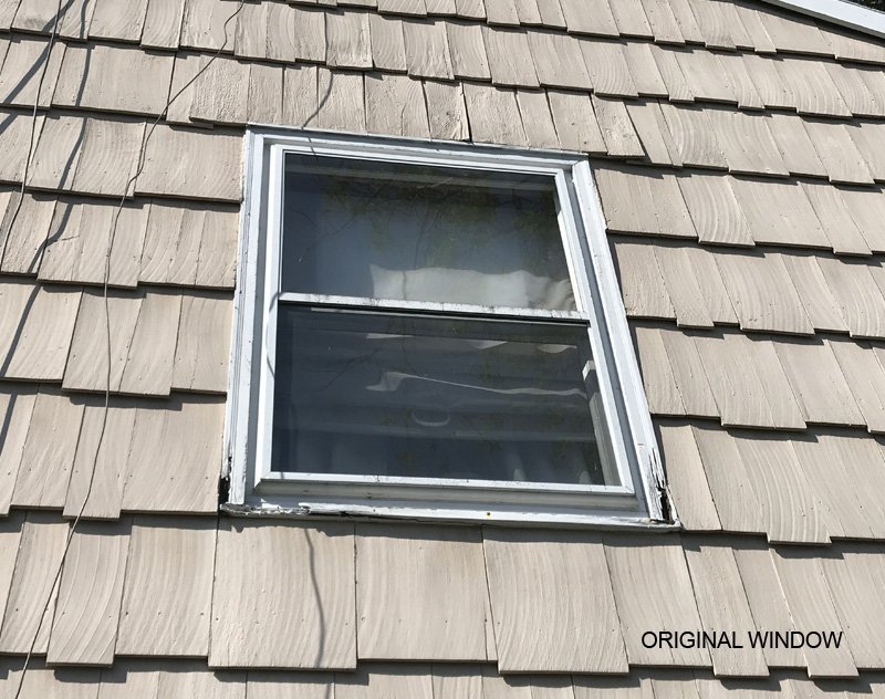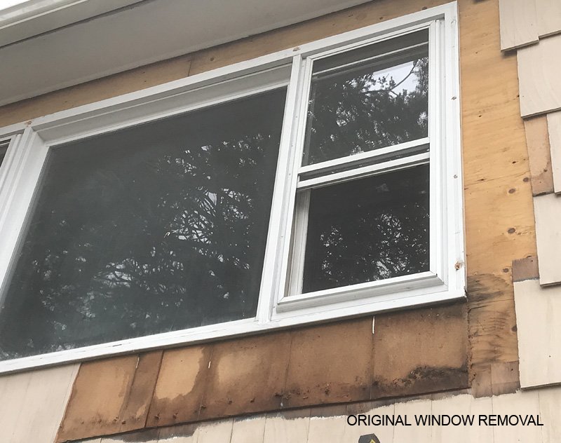 This client got an estimate from Renewal By Andersen to replace all of their old, rotting, single-pane windows with expensive, custom-sized replacement windows. But I saved them thousands by ordering standard-sized Andersen windows that were very close to the same size as their existing windows. All windows conformed to egress codes, and slight adjustments to the framing/window openings, along with minor drywall repairs, were needed. On the exterior, I replaced the cedar shake siding and insulated backer-board that surrounded the windows, and matched the exterior paint color perfectly. When it was done, you would never know they had their windows replaced beyond the fact that they now had beautiful, new, energy-efficient Andersen windows, and saving on their heating and cooling costs. The next several slides illustrate the project from start to finish..